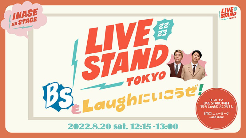 『BSよしもと公開生放送 LIVE STAND特番!「BSもLaughにいこうぜ!!」』 時間変更のお知らせ 8/20(土)INASE NA STAGEにて予定しておりました『BSよしもと公開生放送 LIVE STAND特番!「BSもLaughにいこうぜ!!」』ですが、時間が変更となりました。 8/20(土)12:15-13:00の公演となります。